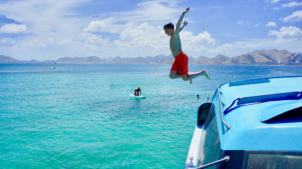 Mullet bay – a locals favorite and a great place to Snorkel, swim and enjoy the thrill of jumping off the boat