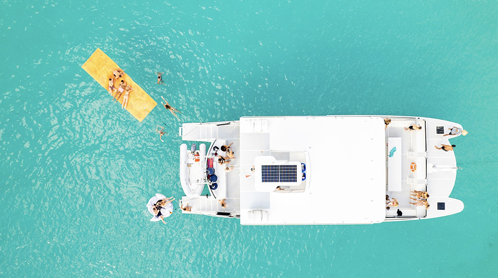 - Enjoy your day to the fullest on our Fast and Stable Power Catamaran with plenty of shade to keep cool, relax on the beanbags on the bow, and comfy seating throughout.